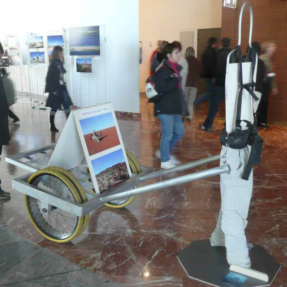 This desert cart has been build specifically for the Simpson Desert with 2 main objectives: to be puncture proof and to not break under heavy weight up to 200 kg loads. It has been tested on macadam with 4 adults on it so with a load of over 300 kg.